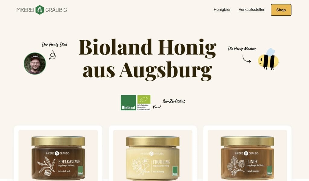 Wir möchten ja nicht angeben, aber: Hier hatten wir unsere Finger im Spiel! Hier geht es zum Shop der Imkerei Gräubig, wo selbst die Bienchen einen Alt-Text haben dürfen. (Denn wie uns eine blinde Person rückgemeldet hat, sind sie ganz und gar nicht nur dekorativ, sondern Teil der verspielten Marke!)