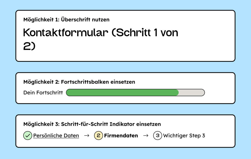 - Überschrift: Die einfachste Möglichkeit ist es, den Fortschritt in die Überschrift mit aufzunehmen. Das kann man zum Beispiel ganz simpel hinter einer Überschrift in Klammern ergänzen: Kontaktformular (Schritt 1 von 2).