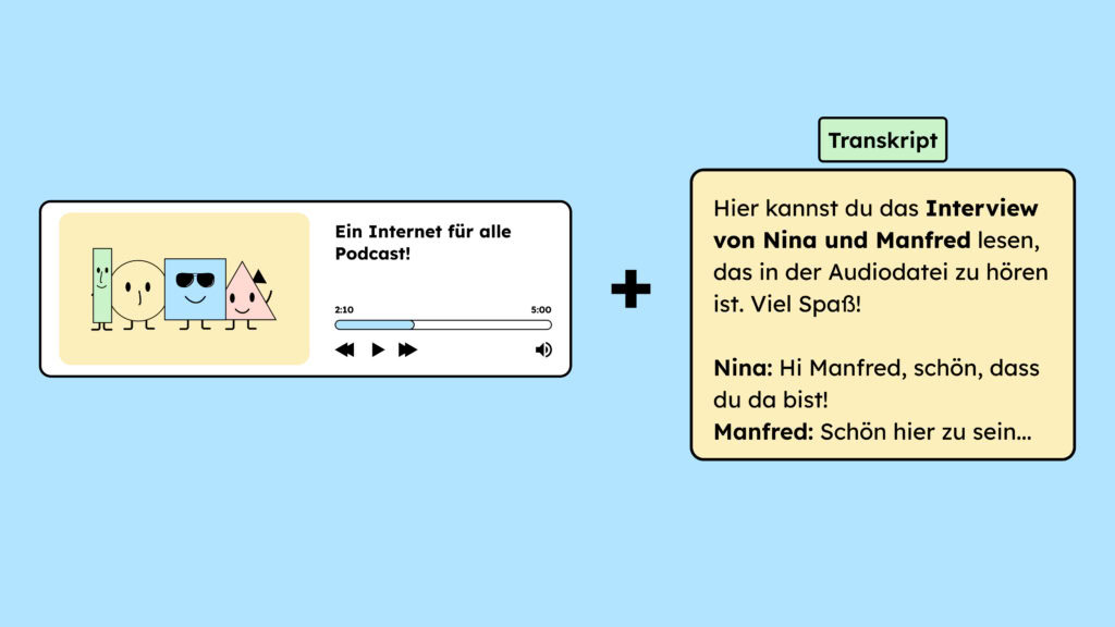 Transkripte machen alles Hörbare in Textform zugänglich und ermöglichen so auch Menschen mit Hörbehinderungen, Inhalte zu erfassen. Gleichzeitig profitieren alle Nutzer*innen, die Inhalte schneller suchen, in Ruhe lesen oder übersetzen wollen.